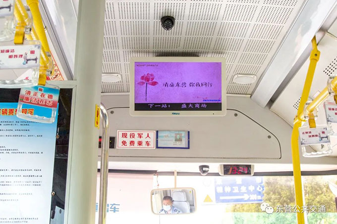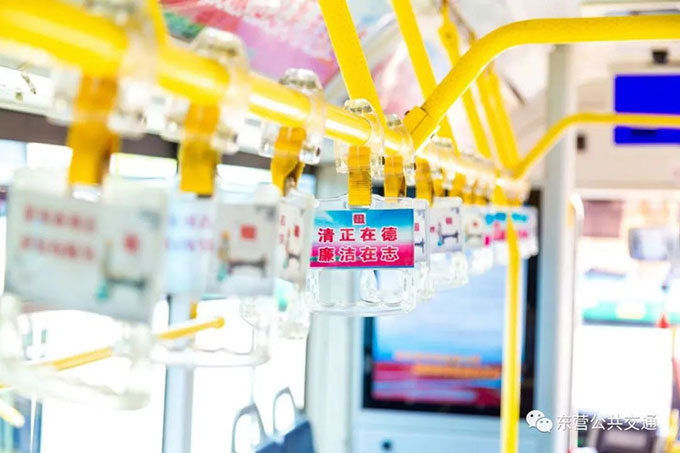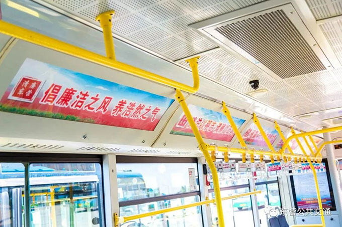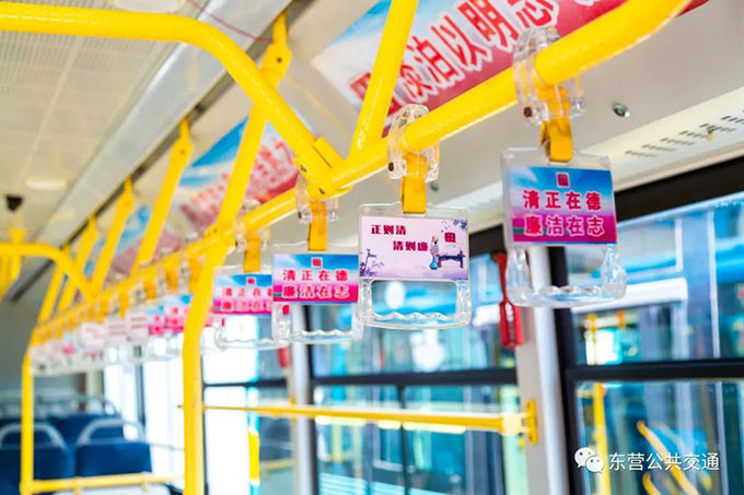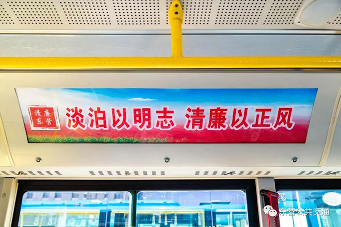該專線在車體兩側(cè)貼有融入東營(yíng)本土地域特色的廉潔文化廣告,車廂內(nèi)燈箱、拉手環(huán)等部位,設(shè)計(jì)植入了廉潔名言警句等廉潔元素,公交車車載電視媒體平臺(tái)循環(huán)播放廉潔文化微視頻、微電影以及動(dòng)漫視頻,讓市民充分感受“進(jìn)車有廉、抬頭見(jiàn)廉”廉潔文化氛圍,在乘車中感受廉潔文化熏陶,自覺(jué)將思廉、崇廉、尚廉意識(shí)轉(zhuǎn)化為守廉、踐廉行動(dòng)。