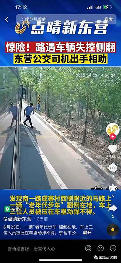 6月23日下午兩點五十分,孫建強臨時執行26路運行任務時,看到一輛“老年代步車”側翻在地,他立馬停下公交車撥打了120電話,并對車內的三名被困人員進行緊急施救。在醫護人員到來前,他又從公交車上拿了些衛生紙和礦泉水,幫傷者清理了傷口。直到目送著傷者被120送往醫院,孫建強懸著的心終于放下。