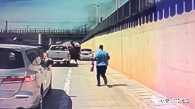 6月30下午,蘇文海像往常一樣駕駛著51路公交車由北往南方向行駛至六戶附近時,看到前面壓車情況嚴(yán)重,就慢慢把車停了下來。接著他發(fā)現(xiàn)在遠處一輛私家車正冒著滾滾濃煙,車上的一堆家具,外包裝已經(jīng)有了明火,車主和周圍旁觀市民正手足無措的站在車旁邊,情況十分緊急。蘇文海見狀立刻打開公交車應(yīng)急雙閃燈,提著車?yán)锏膬蓚€滅火器就沖了下去。