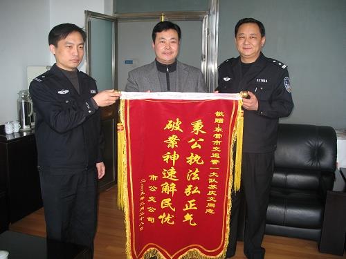 3月2日,為感謝交警部門秉公執法,伸張正義,市公交公司委派汽車一隊的兩位隊長向事故處理中心干警蘇慶文同志贈送了“破案神速解民憂,秉公執法弘正氣”的錦旗。