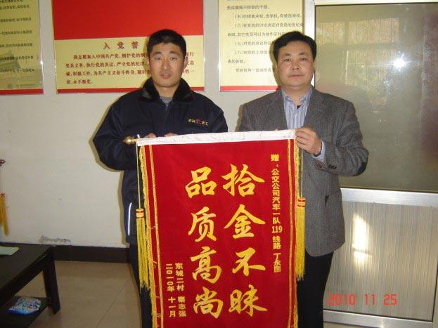 11月25日上午,齊潤化工廠的秦志強先生拿著一面寫有“拾金不昧、品質(zhì)高尚”的錦旗來到市公交公司汽車一隊,感謝119路駕駛員丁永國師傅拾金不昧的高尚品德。據(jù)車隊了解得知,11月24日,秦先生的母親在齊潤化工廠丁莊駐地領(lǐng)取完1000元的“孝心取暖費”后,乘坐119路返回東城,回家后發(fā)現(xiàn)現(xiàn)金不見了,抱著試試看的想法來到汽車一隊詢問得知,駕駛員丁永國師傅已將現(xiàn)金1029元上繳車隊等待失主認領(lǐng)。秦先生告訴車隊領(lǐng)導,他的母親患有高血壓病史,現(xiàn)金丟失后老人心急如焚,當時就癱坐在車隊辦公室內(nèi),幸虧車隊的田隊長熱情接待,及時核對情況后,將錢物如數(shù)歸還并將老人安全地送到回家的車上。